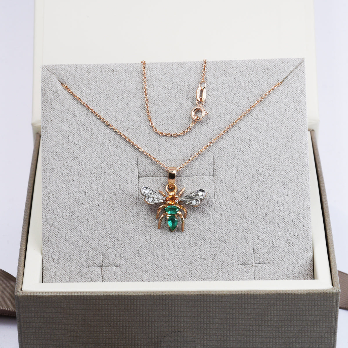 Collana con Ciondolo Libellula in Oro Rosa 9K e Argento con Zaffiri Naturali e Diamanti e Smeraldi Lab