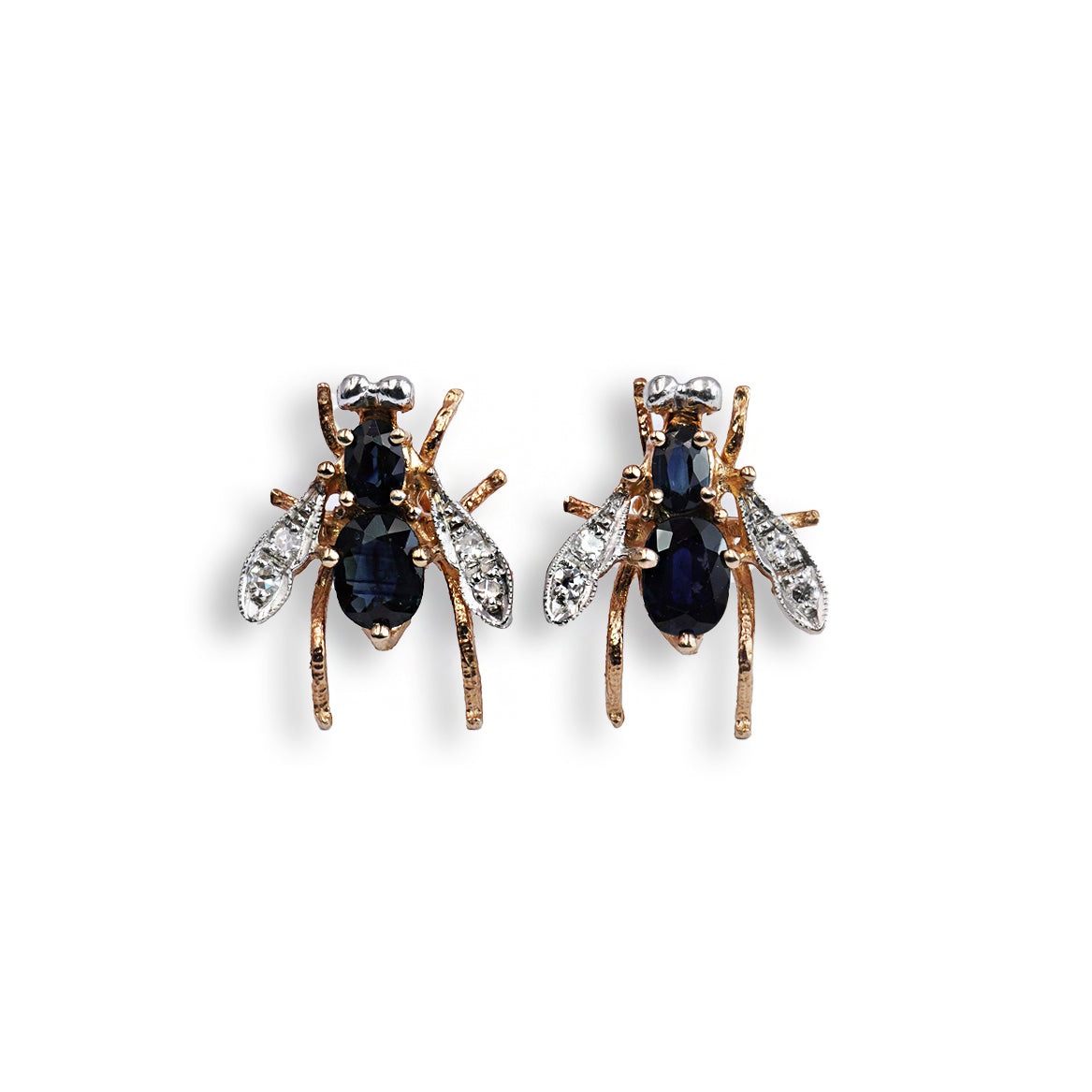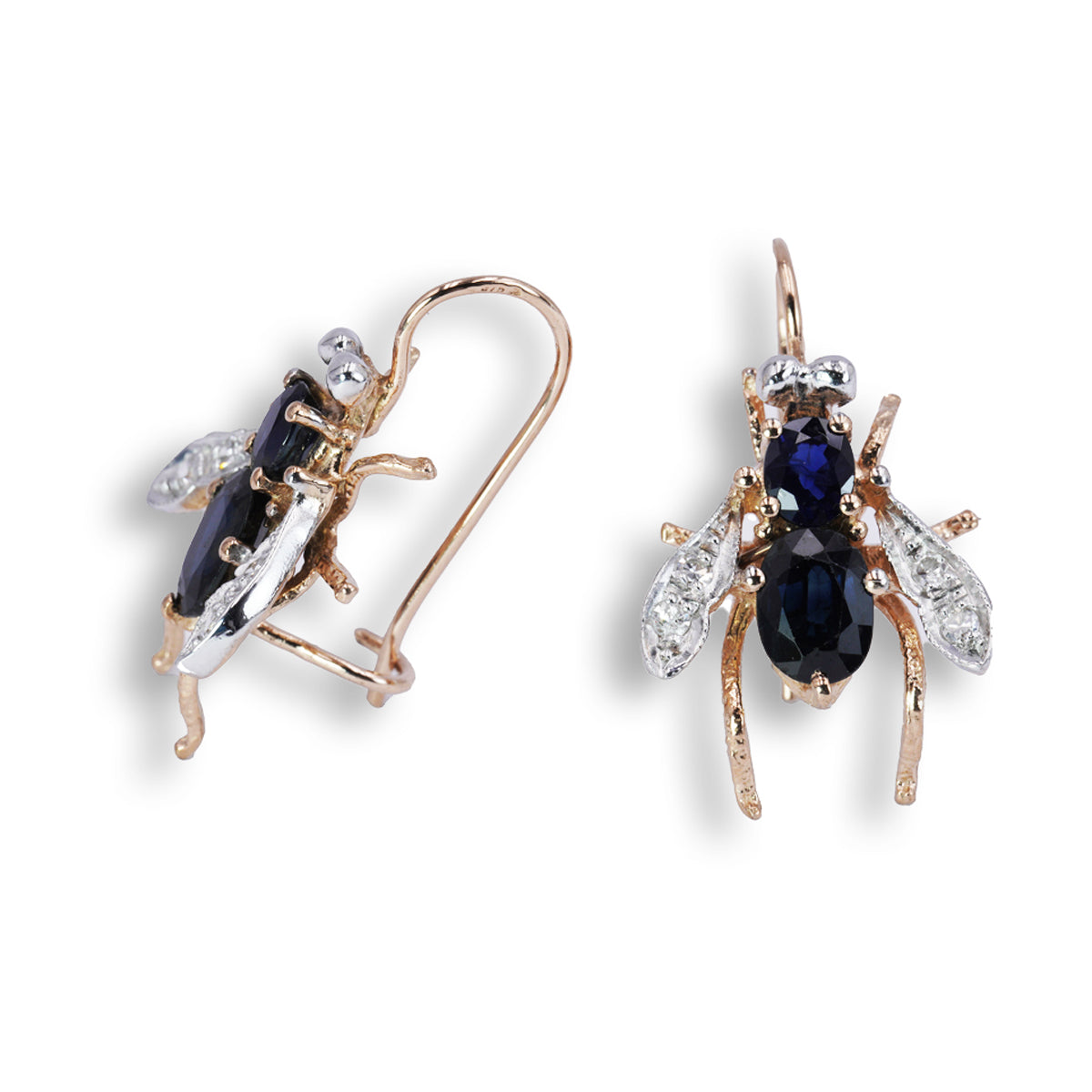 Orecchini " Mosca Pendenti " in Oro Rosa 9K e Argento con Zaffiri Naturali e Diamanti